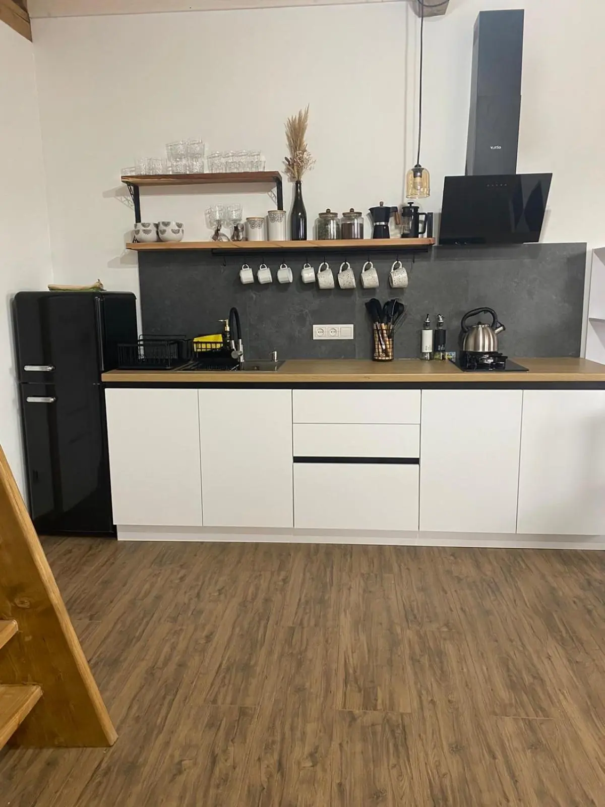 Кухонне обладнання включає мікрохвильову піч, електрочайник і холодильник.